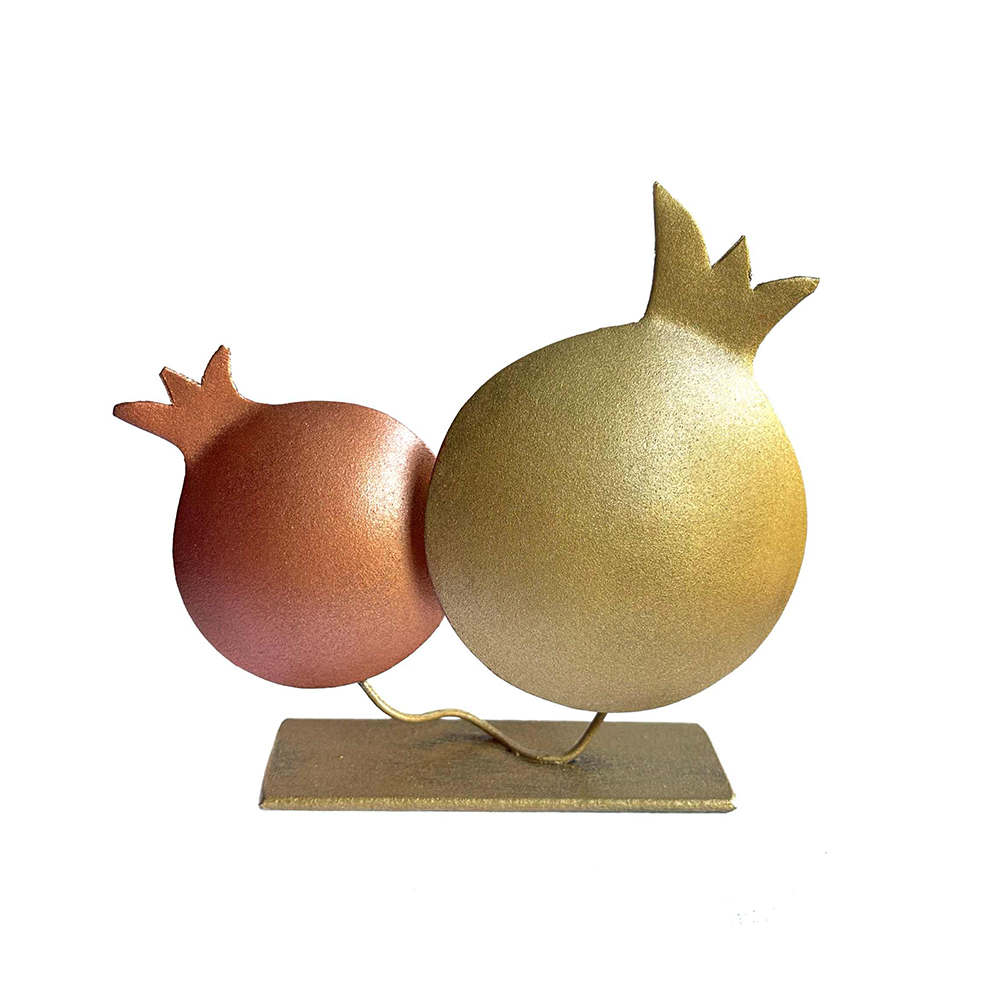 Ένα κομψό και μοντέρνο διακοσμητικό με δύο ρόδια σε χάλκινη και χρυσή απόχρωση, σύμβολα τύχης, αγάπης και ευημερίας. Η σύνθεση αποπνέει ζεστασιά και αρμονία, ιδανική για να στολίσει το σαλόνι, το γραφείο ή να προσφερθεί ως δώρο σε αγαπημένα πρόσωπα.