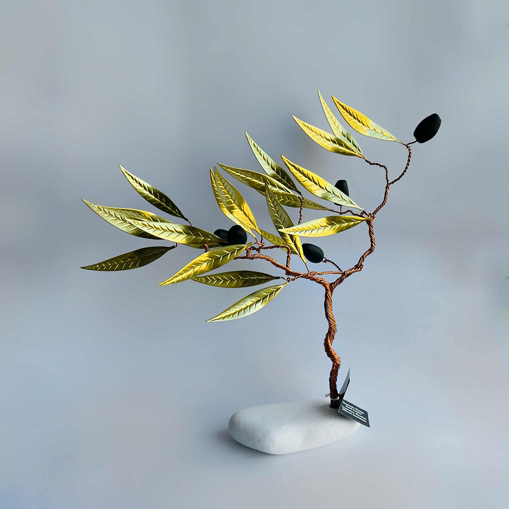 Ένα χειροποίητο διακοσμητικό δέντρο ελιάς, φτιαγμένο με χαλκό, ορείχαλκο και λευκό βότσαλο και πλάγια κίνηση.
