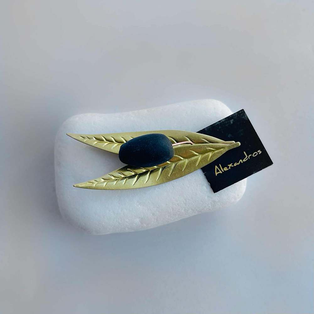 Ένα χειροποίητο διακοσμητικό 2φυλλο κλαδί ελιάς, φτιαγμένο με ορείχαλκο πάνω σε λευκό βότσαλο.