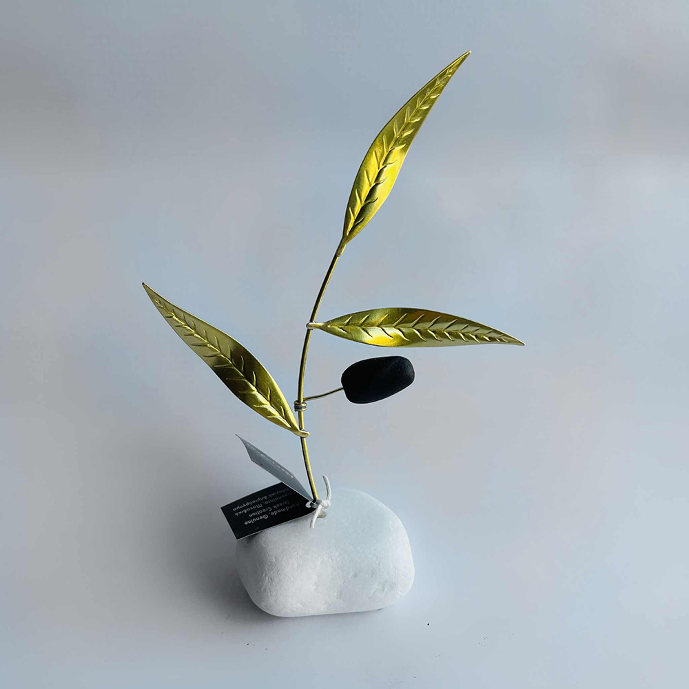 Ένα χειροποίητο διακοσμητικό κλαδί ελιάς, φτιαγμένο με ορείχαλκο και λευκό βότσαλο.