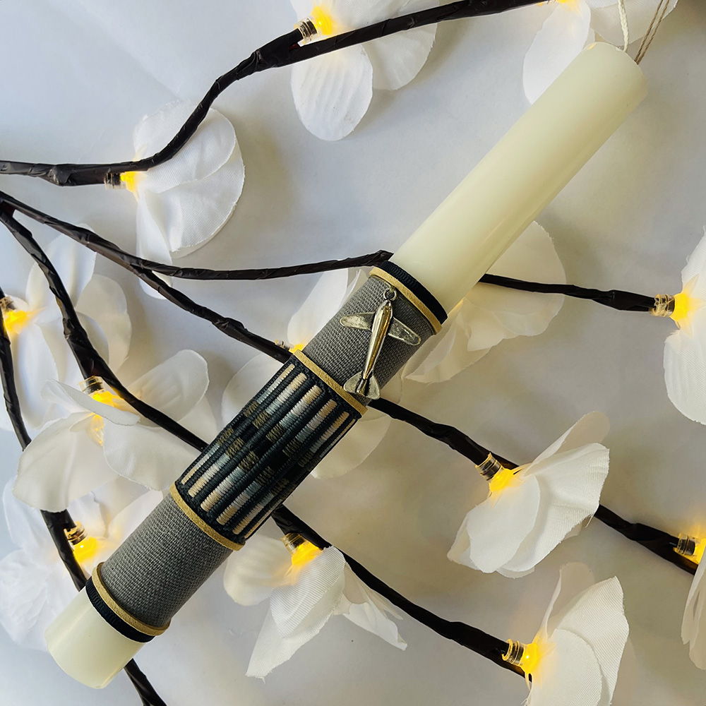 Χειροποίητη πασχαλινή λαμπάδα, ιδανική για εφήβους. Η λευκή, αρωματική λαμπάδα είναι διακοσμημένη με γκρι ύφασμα, κίτρινες και μαύρες κορδέλες και μεταλλικο διακοσμητικό αεροπλάνο.