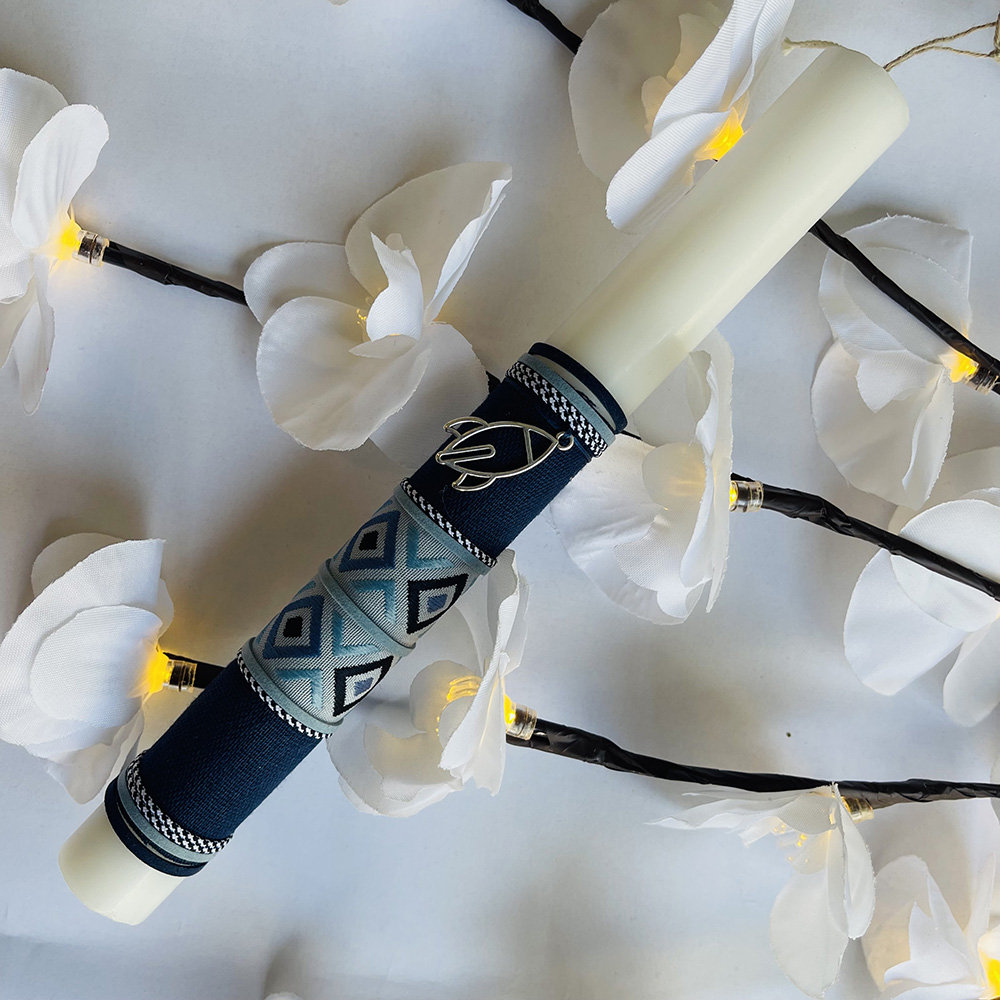 Χειροποίητη πασχαλινή λαμπάδα, ιδανική για εφήβους. Η λευκή, αρωματική λαμπάδα είναι διακοσμημένη με ύφασμα με γεωμετρικά σχέδια σε αποχρώσεις του μπλε και μεταλλικό διακοσμητικό πύραυλο.