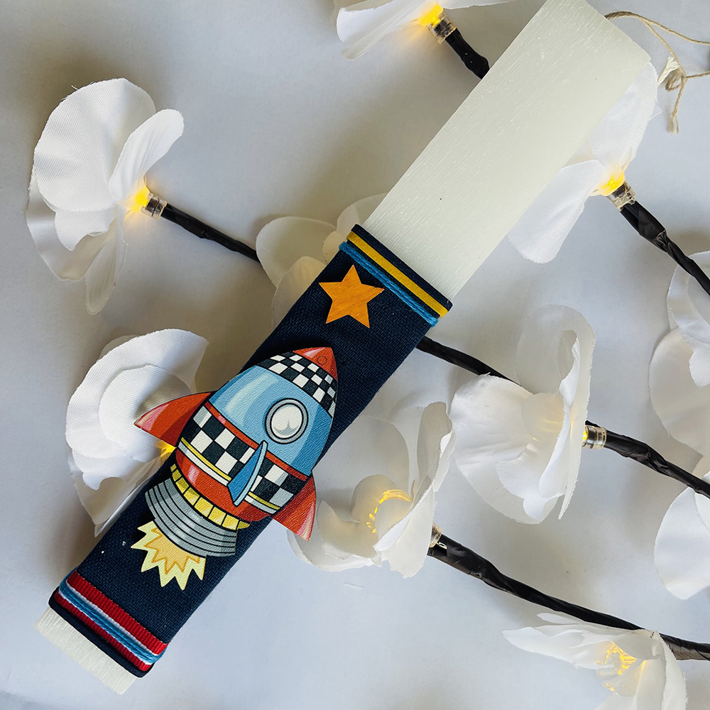 Χειροποίητη πασχαλινή λαμπάδα, ιδανική για αγόρι. Η εκρού, αρωματική λαμπάδα είναι διακοσμημένη με ένα υπέροχο πολύχρωμο εικαστικό με πύραυλο, πάνω σε φόντο με αστεράκια και έντονες μπλε λεπτομέρειες.