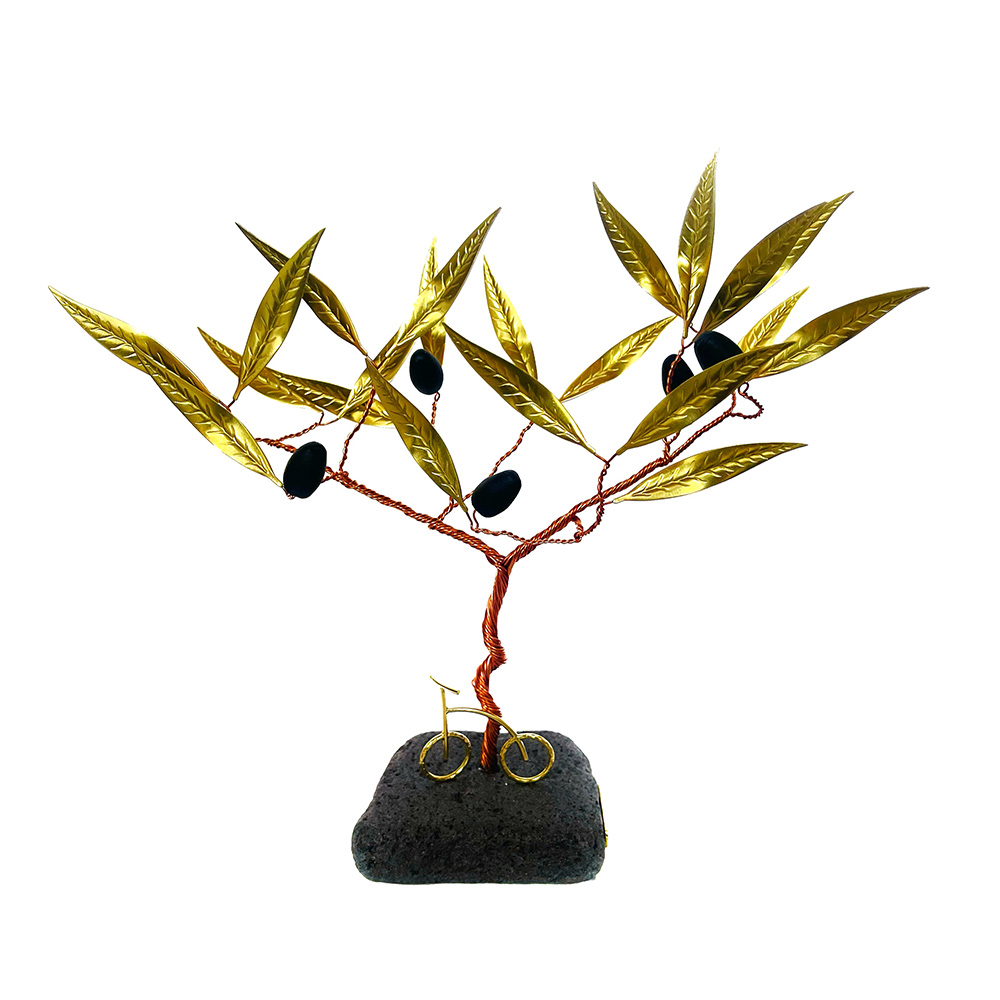 Ένα ξεχωριστό χειροποίητο διακοσμητικό δέντρο που συμβολίζει την αγάπη και τη σταθερότητα. Φτιαγμένο με χαλκό, ορείχαλκο και πέτρα λάβας, το έργο απεικονίζει ένα ποδήλατο κάτω από ένα δέντρο ελιάς.